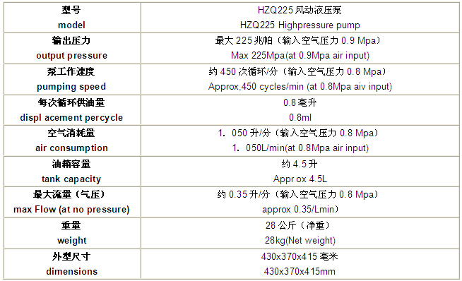 HZQ系列風(fēng)動(dòng)液壓泵具有輸出壓力高、操作簡(jiǎn)便、安全可靠、攜帶方便等優(yōu)點(diǎn)。可廣泛適用于冶金礦山、石油化工、船舶工業(yè)、機(jī)車(chē)車(chē)輛待制造行業(yè)中的大中型機(jī)械螺釘緊固和大型傳動(dòng)件,結(jié)構(gòu)件的無(wú)鍵配合。省時(shí)省力、鈽力均勻、密封可靠,是各種大中型機(jī)械組裝和配套的理想工具。 技術(shù)參數(shù):